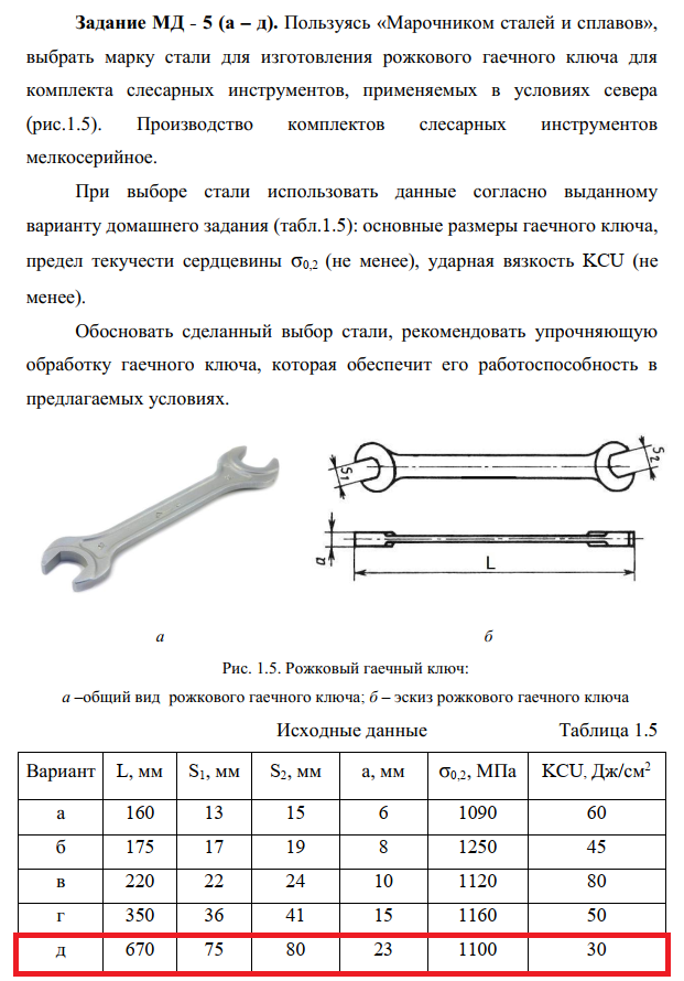 Задание МД - 5 (а – д). Пользуясь «Марочником сталей и сплавов», выбрать марку стали для изготовления рожкового гаечного ключа для комплекта слесарных инструментов, применяемых в условиях севера (рис.1.5). Производство комплектов слесарных инструментов мелкосерийное. При выборе стали использовать данные согласно выданному варианту домашнего задания (табл.1.5): основные размеры гаечного ключа, предел текучести сердцевины σ0,2 (не менее), ударная вязкость KCU (не менее).            Обосновать сделанный выбор стали, рекомендовать упрочняющую обработку гаечного ключа, которая обеспечит его работоспособность в предлагаемых условиях.  .