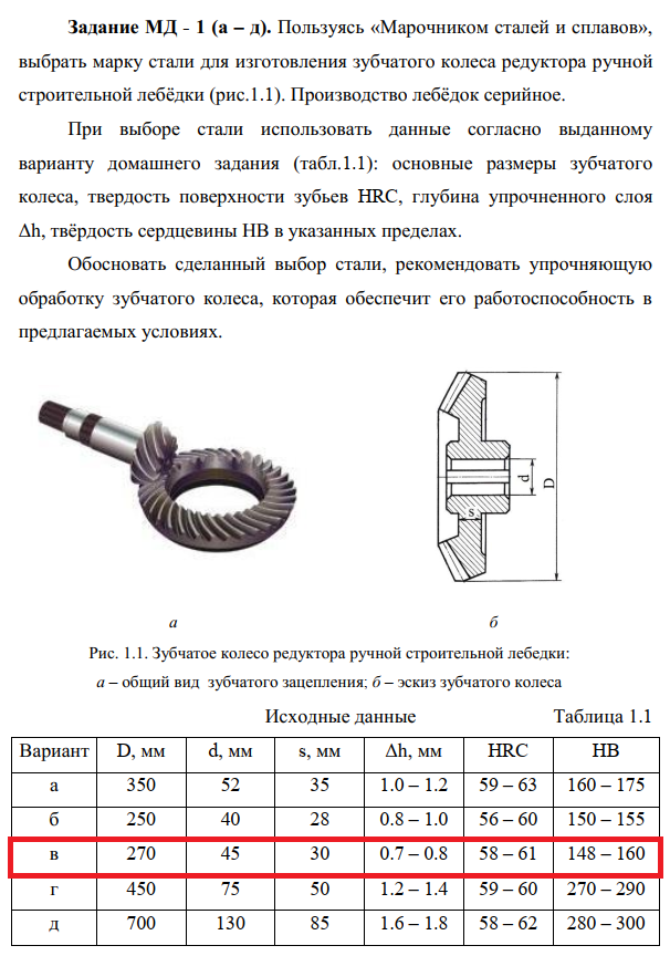 Задание МД - 1 (а – д). Пользуясь «Марочником сталей и сплавов», выбрать марку стали для изготовления зубчатого колеса редуктора ручной строительной лебёдки (рис.1.1). Производство лебёдок серийное. При выборе стали использовать данные согласно выданному варианту домашнего задания (табл.1.1): основные размеры зубчатого колеса, твердость поверхности зубьев HRC, глубина упрочненного слоя Δh, твёрдость сердцевины НВ в указанных пределах. Обосновать сделанный выбор стали, рекомендовать упрочняющую обработку зубчатого колеса, которая обеспечит его работоспособность в предлагаемых условиях. .