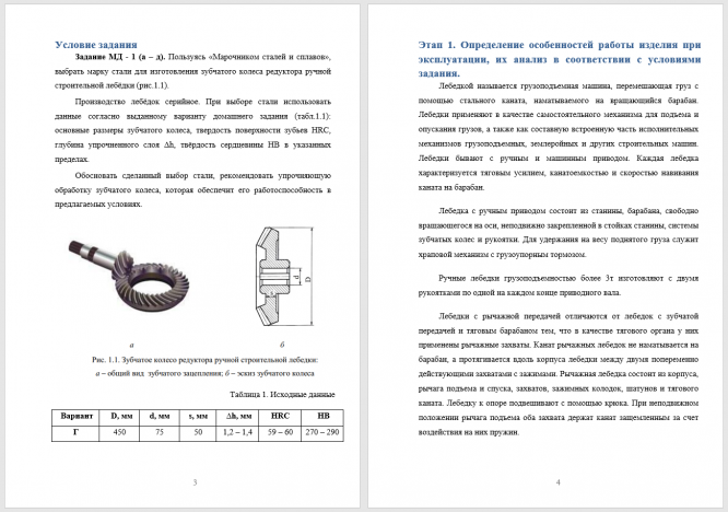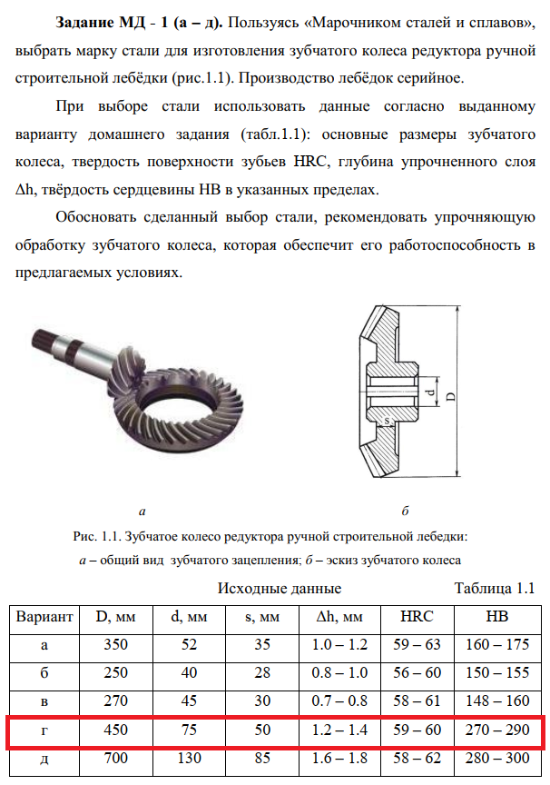 Задание МД - 1 (а – д). Пользуясь «Марочником сталей и сплавов», выбрать марку стали для изготовления зубчатого колеса редуктора ручной строительной лебёдки (рис.1.1). Производство лебёдок серийное. При выборе стали использовать данные согласно выданному варианту домашнего задания (табл.1.1): основные размеры зубчатого колеса, твердость поверхности зубьев HRC, глубина упрочненного слоя Δh, твёрдость сердцевины НВ в указанных пределах. Обосновать сделанный выбор стали, рекомендовать упрочняющую обработку зубчатого колеса, которая обеспечит его работоспособность в предлагаемых условиях. .
