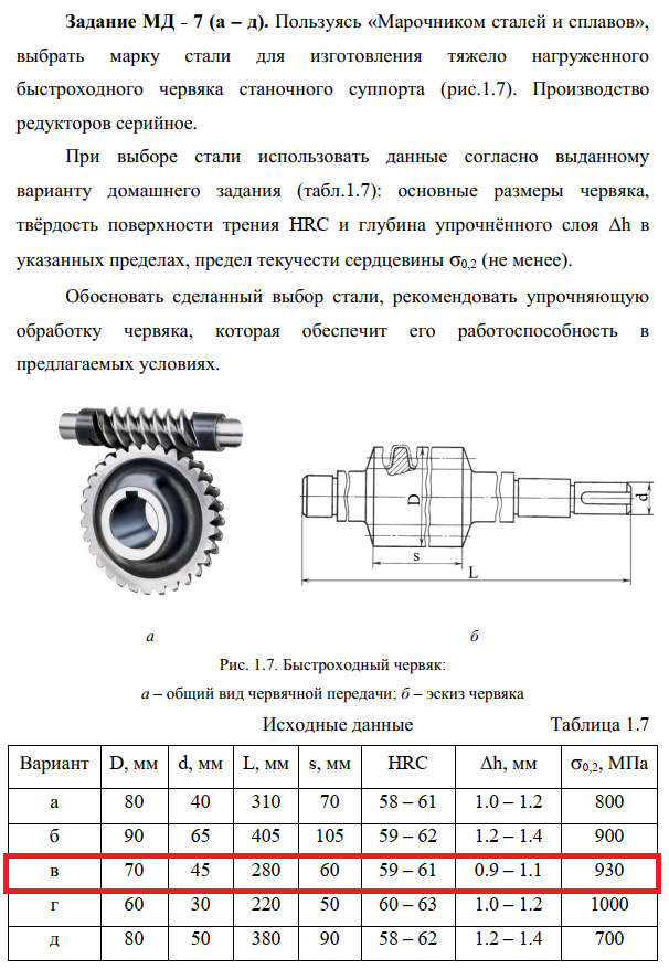 Задание МД - 7 (а – д). Пользуясь «Марочником сталей и сплавов», выбрать марку стали для изготовления тяжело нагруженного быстроходного червяка станочного суппорта (рис.1.7). Производство редукторов серийное. При выборе стали использовать данные согласно выданному варианту домашнего задания (табл.1.7): основные размеры червяка, твёрдость поверхности трения HRC и глубина упрочнённого слоя Δh в указанных пределах, предел текучести сердцевины σ0,2 (не менее).   Обосновать сделанный выбор стали, рекомендовать упрочняющую обработку червяка, которая обеспечит его работоспособность в предлагаемых условиях..