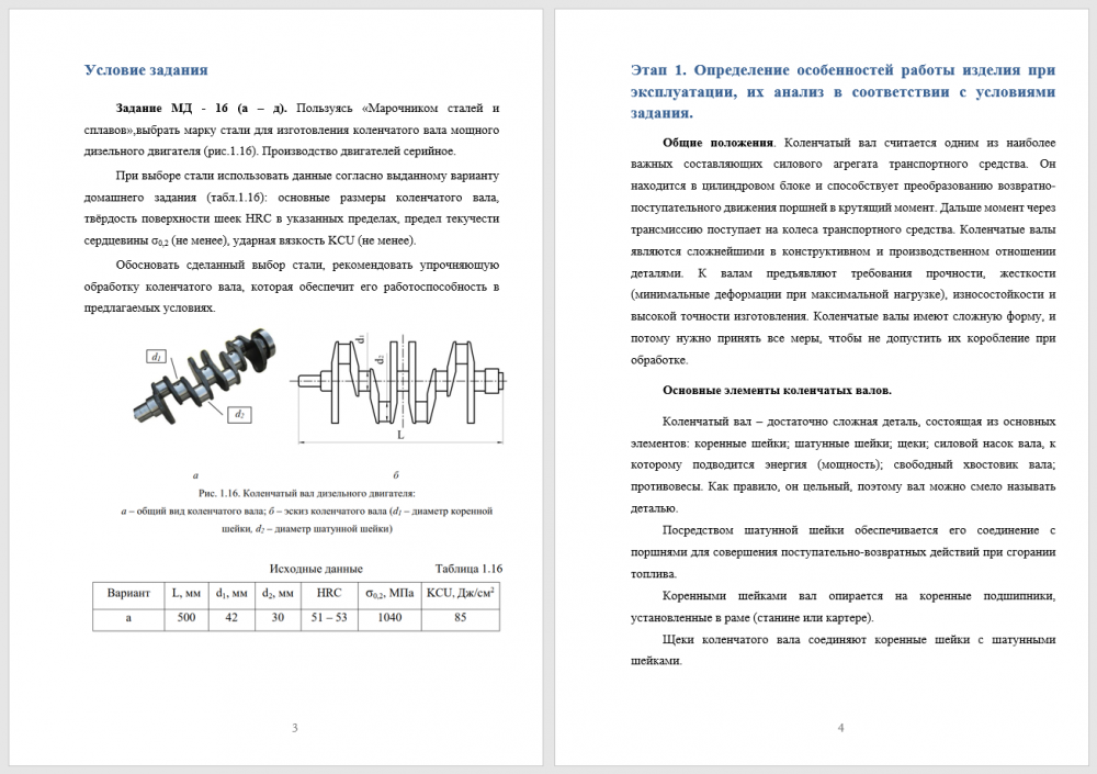 Задание МД - 16 (а – д). Пользуясь «Марочником сталей и сплавов»,выбрать марку стали для изготовления коленчатого вала мощного дизельного двигателя (рис.1.16). Производство двигателей серийное. При выборе стали использовать данные согласно выданному варианту домашнего задания (табл.1.16): основные размеры коленчатого вала, твёрдость поверхности шеек HRC в указанных пределах, предел текучести сердцевины σ0,2 (не менее), ударная вязкость KCU (не менее). Обосновать сделанный выбор стали, рекомендовать упрочняющую обработку коленчатого вала, которая обеспечит его работоспособность в предлагаемых условиях..