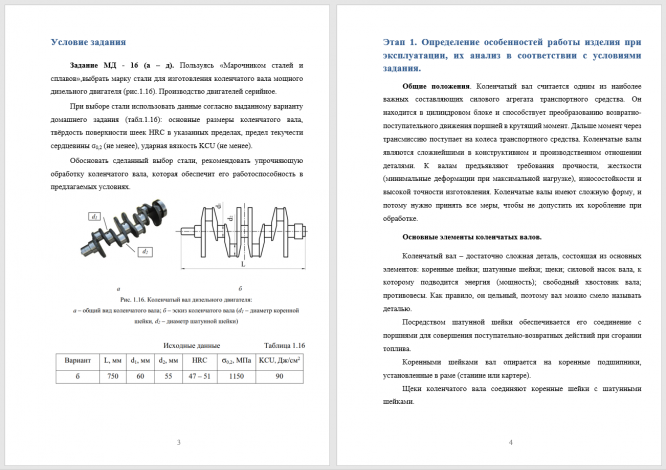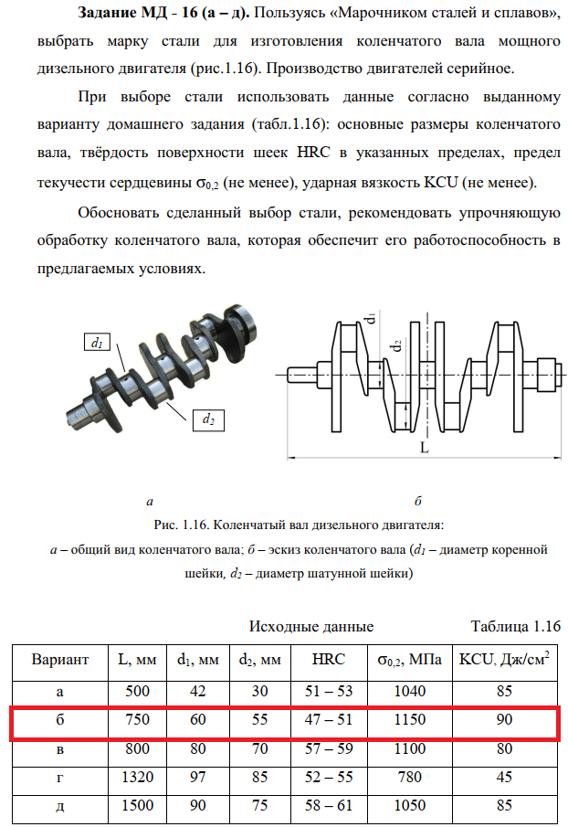 Задание МД - 16 (а – д). Пользуясь «Марочником сталей и сплавов»,выбрать марку стали для изготовления коленчатого вала мощного дизельного двигателя (рис.1.16). Производство двигателей серийное. При выборе стали использовать данные согласно выданному варианту домашнего задания (табл.1.16): основные размеры коленчатого вала, твёрдость поверхности шеек HRC в указанных пределах, предел текучести сердцевины σ0,2 (не менее), ударная вязкость KCU (не менее). Обосновать сделанный выбор стали, рекомендовать упрочняющую обработку коленчатого вала, которая обеспечит его работоспособность в предлагаемых условиях..