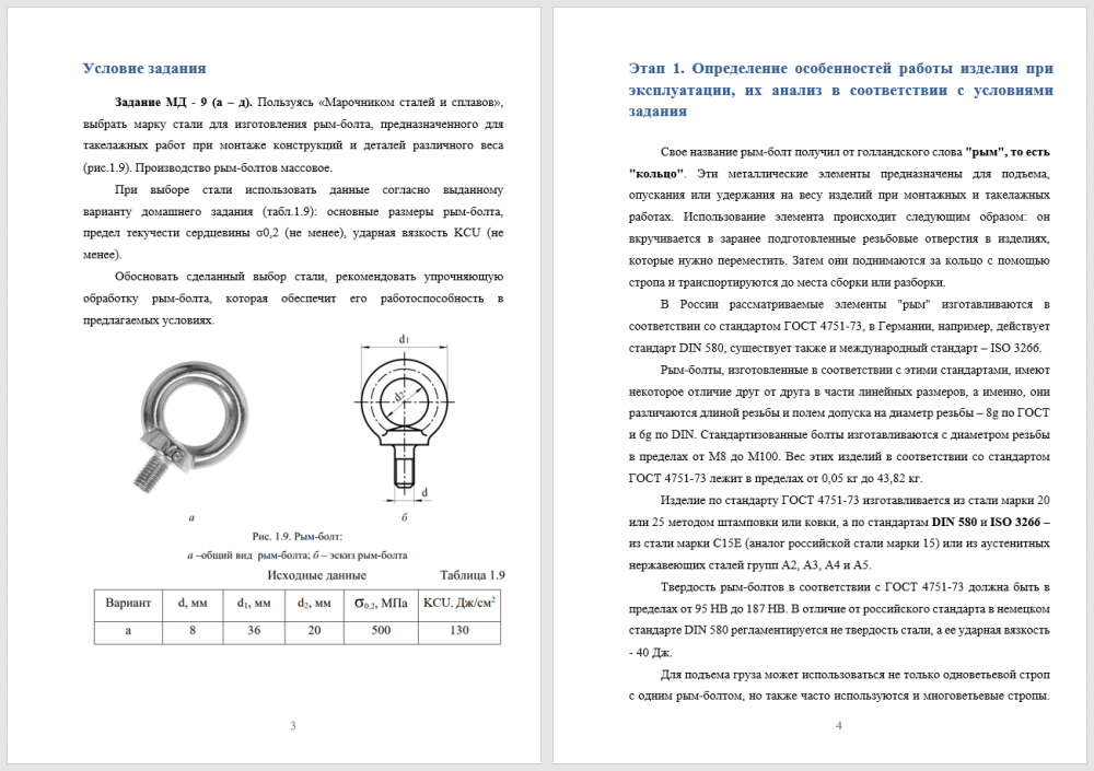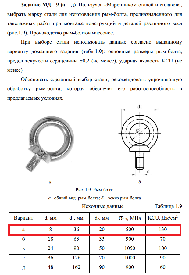 Задание МД - 9 (а – д). Пользуясь «Марочником сталей и сплавов», выбрать марку стали для изготовления рым-болта, предназначенного для такелажных работ при монтаже конструкций и деталей различного веса (рис.1.9). Производство рым-болтов массовое. При выборе стали использовать данные согласно выданному варианту домашнего задания (табл.1.9): основные размеры рым-болта, предел текучести сердцевины σ0,2 (не менее), ударная вязкость KCU (не менее). Обосновать сделанный выбор стали, рекомендовать упрочняющую обработку рым-болта, которая обеспечит его работоспособность в предлагаемых условиях..