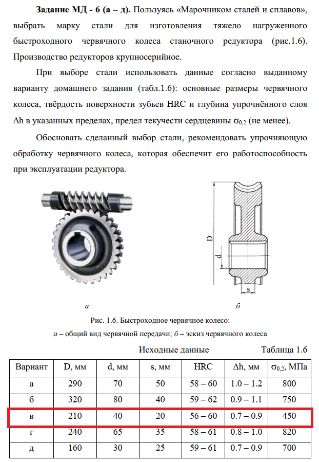Задание МД - 6 (а – д). Пользуясь «Марочником сталей и сплавов», выбрать марку стали для изготовления тяжело нагруженного быстроходного червячного колеса станочного редуктора (рис.1.6). Производство редукторов крупносерийное. При выборе стали использовать данные согласно выданному варианту домашнего задания (табл.1.6): основные размеры червячного колеса, твёрдость поверхности зубьев HRC и глубина упрочнённого слоя Δh в указанных пределах, предел текучести сердцевины σ0,2 (не менее). Обосновать сделанный выбор стали, рекомендовать упрочняющую обработку червячного колеса, которая обеспечит его работоспособность при эксплуатации редуктора..