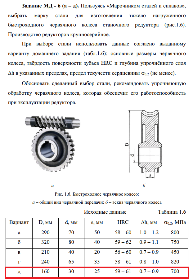 Задание МД - 6 (а – д). Пользуясь «Марочником сталей и сплавов», выбрать марку стали для изготовления тяжело нагруженного быстроходного червячного колеса станочного редуктора (рис.1.6). Производство редукторов крупносерийное. При выборе стали использовать данные согласно выданному варианту домашнего задания (табл.1.6): основные размеры червячного колеса, твёрдость поверхности зубьев HRC и глубина упрочнённого слоя Δh в указанных пределах, предел текучести сердцевины σ0,2 (не менее). Обосновать сделанный выбор стали, рекомендовать упрочняющую обработку червячного колеса, которая обеспечит его работоспособность при эксплуатации редуктора..