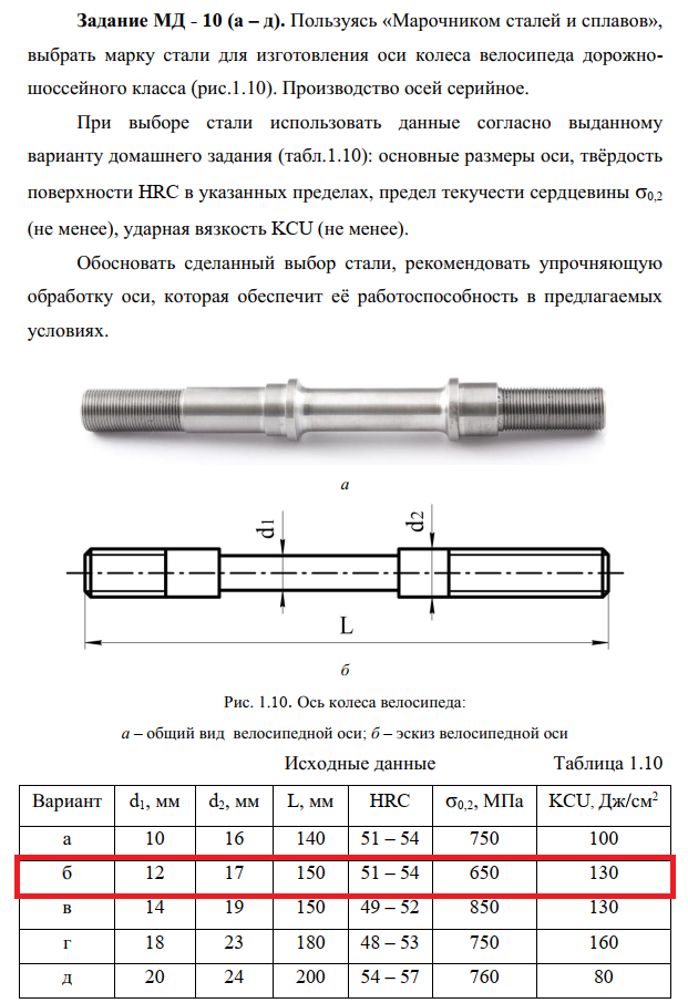 Задание МД - 1 0 (а – д). Пользуясь «Марочником сталей и сплавов», выбрать марку стали для изготовления оси колеса велосипеда дорожношоссейного класса (рис.1.10). Производство осей серийное. При выборе стали использовать данные согласно выданному варианту домашнего задания (табл.1.10): основные размеры оси, твёрдость поверхности HRC в указанных пределах, предел текучести сердцевины σ0,2 (не менее), ударная вязкость KCU (не менее). Обосновать сделанный выбор стали, рекомендовать упрочняющую обработку оси, которая обеспечит её работоспособность в предлагаемых условиях ..