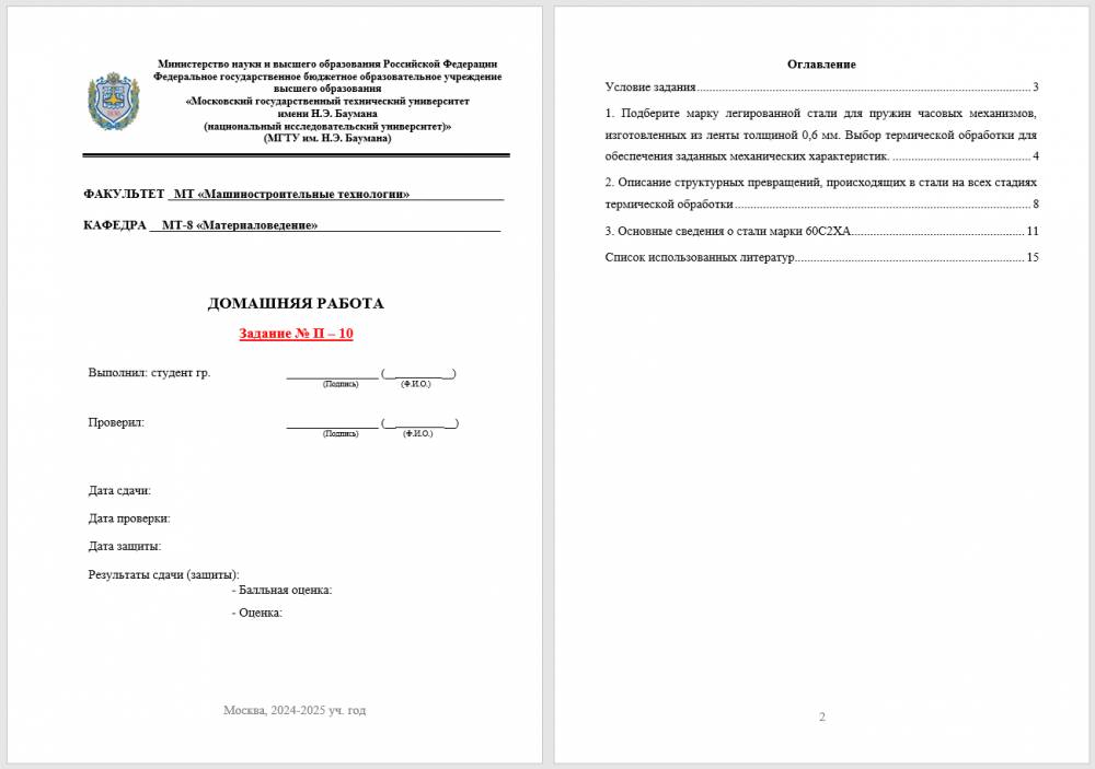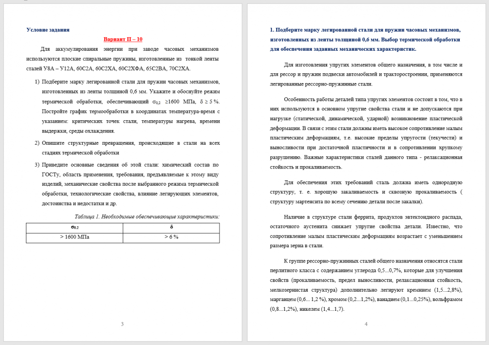 Задание П – 10. Для аккумулирования энергии при заводе часовых механизмов используются плоские спиральные пружины, изготовленные из тонкой ленты сталей: У8А – У12А, 60С2А, 60С2ХА, 60С2ХФА, 65С2ВА,70С2ХА. Подберите марку легированной стали для пружин часовых механизмов, изготовленных из ленты толщиной 0,6 мм. Укажите и обоснуйте режим термической обработки, обеспечивающей σ0,2 ≥1600 МПА, δ ≥ 5 %.Постройте график термообработки в координатах температура-время с указанием: критических точек стали, температуры нагрева ,времени выдержки, среды охлаждения. Опишите структурные превращения, происходящие встали на всех стадиях термической обработке. Приведите основные сведения об этой стали: химический состав по ГОСТу, область применения, требования, предъявляемые к этому виду изделий, механические свойства после выбранного режима термической обработки, технологические свойства, влияние легирующих элементов, достоинства и недостатки и др..