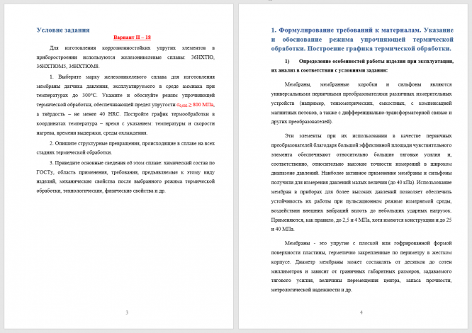 Задание П – 18. Для изготовления коррозионностойких упругих элементов в приборостроении используются железоникелевые сплавы: 36НХТЮ, 36НХТЮМ5, 36НХТЮМ8. Выберите марку железоникелевого сплава для изготовления мембраны датчика давления, эксплуатируемого в среде аммиака при температурах до 300°С. Укажите и обоснуйте режим упрочняющей термической обработки, обеспечивающей предел упругости σ0,002 ≥ 800 МПа, а твёрдость – не менее 40 HRC. Постройте график термообработки в координатах температура – время с указанием: температуры и скорости нагрева, времени выдержки, среды охлаждения. Опишите структурные превращения, происходящие в сплаве на всех стадиях термической обработки.