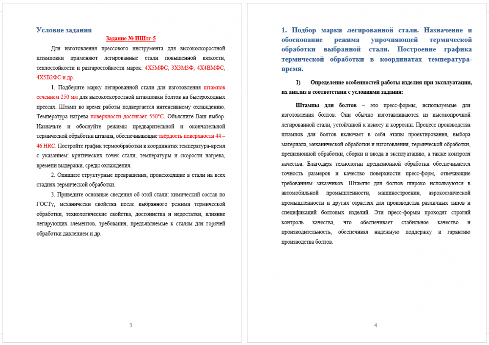 Задание ИШтг – 5. Для изготовления прессового инструмента для высокоскоростной штамповки применяют легированные стали повышенной вязкости, теплостойкости и разгаростойкости марок: 4Х5МФС, 3Х3М3Ф, 4Х4ВМФС, 4Х5В2ФС и др. Подберите марку легированной стали для изготовления штампов сечением 250 мм для высокоскоростной штамповки болтов на быстроходных прессах. Штамп во время работы подвергается интенсивному охлаждению. Температура нагрева поверхности достигает 550°С. Объясните Ваш выбор. Назначьте и обоснуйте режимы предварительной и окончательной термической обработки штампа, обеспечивающие твёрдость поверхности 44 – 46 HRC. Постройте график термообработки в координатах температура-время с указанием: критических точек стали, температуры и скорости нагрева, времени выдержки, среды охлаждения.