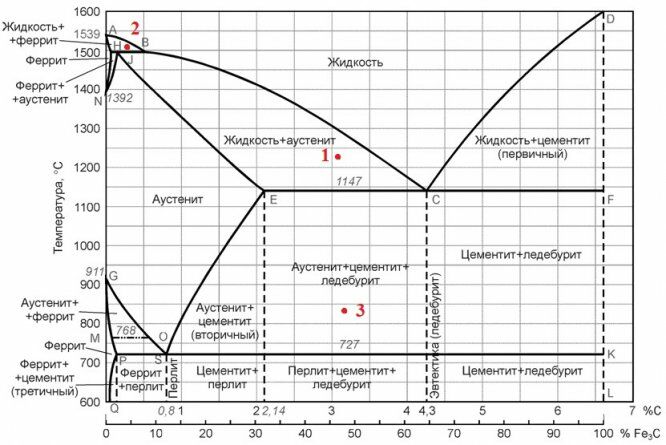 2. Определите концентрацию углерода в каждой фазе в точке 1 двухфазной области, пользуясь правилом концентраций.