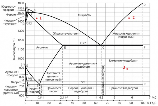 2. Определите концентрацию углерода в каждой фазе в точке 1 двухфазной области, пользуясь правилом концентраций.