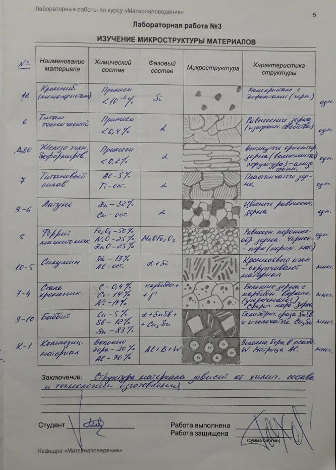 Даны варианты микроструктур различных материалов и указаны их основные характеристики. Сделаны выводы о зависимости микроструктуры от технологии изготовления и химического состава.