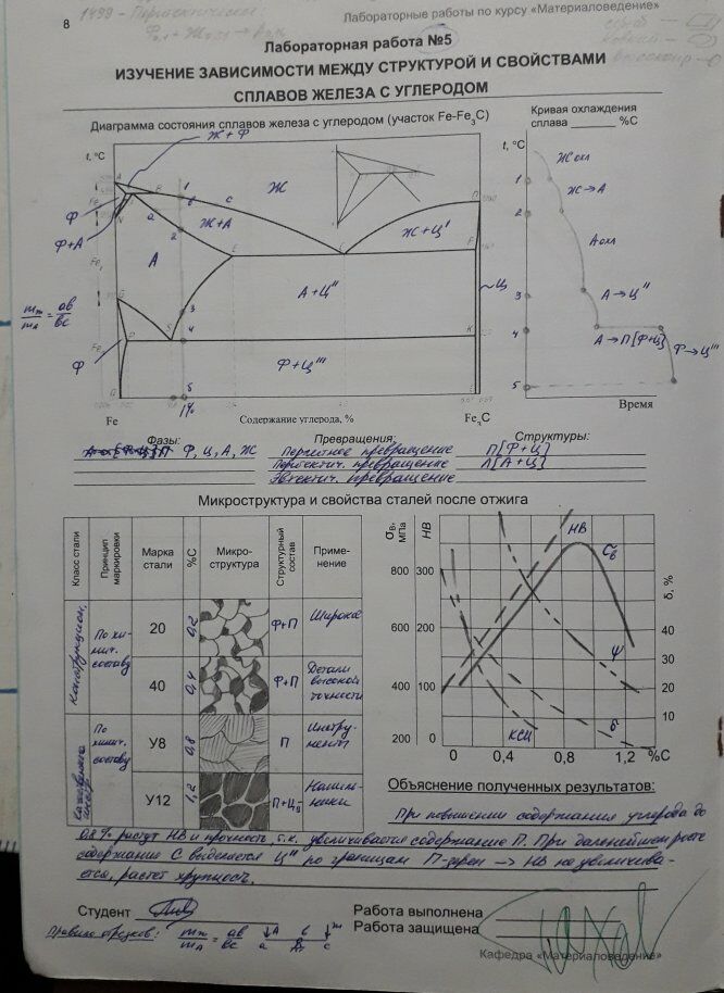 Дана диаграмма состояния сплавов железа с углеродом. Приведены микроструктуры образцов сталей после отжига, а также их свойства. Приведено объяснение полученных результатов.