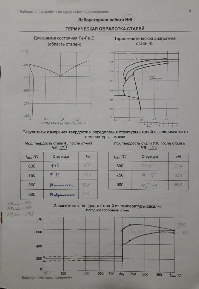 Приведены диаграмма состояния сплавов железа с углеродом и термокинетическая диаграмма стали 45. Измерены значения твердости образцов сталей, прошедших разную закалку, и указана их структура. Графически построена зависимость значения твердости стали от температуры закалки образца. Сделаны выводы по проделанной работе.