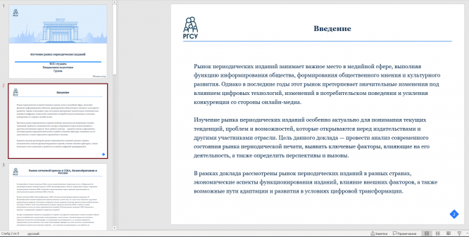 Презентация "Изучение рынка периодических изданий" по предмету "Медиаменеджмент". Содержание: рынок печатной прессы в США, Великобритании и России, рынок печатной прессы в России. В рамках презентации рассмотрены рынок периодических изданий в разных странах, экономические аспекты функционирования изданий, влияние внешних факторов, а также возможные пути адаптации и развития в условиях цифровой трансформации. 9 слайдов, 4 источника.