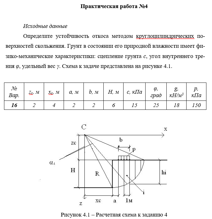 ДЗ 4: Проверяемое задание №4 Тема: Определение устойчивости грунтового откоса вариант 16