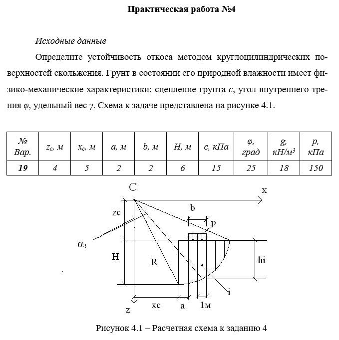 ДЗ 4: Проверяемое задание №4 Тема: Определение устойчивости грунтового откоса вариант 19