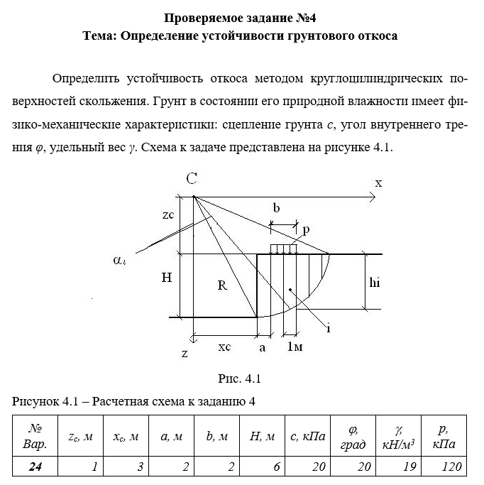 ДЗ 4: Проверяемое задание №4 Тема: Определение устойчивости грунтового откоса вариант 24