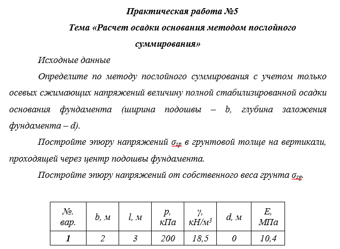 Проверяемое задание №5. Тема «Расчет осадки основания методом послойного суммирования» Вариант 1