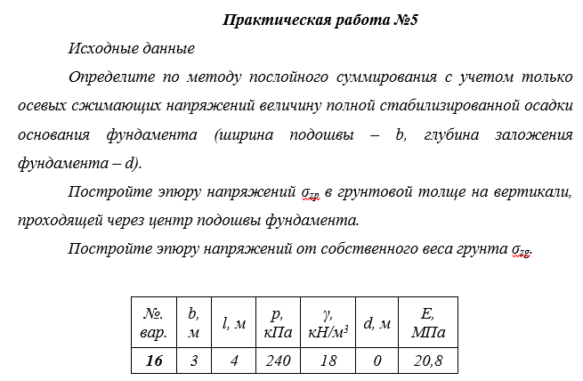 ДЗ 5: Проверяемое задание №5. Тема Расчет осадки основания методом послойного суммирования вариант 16