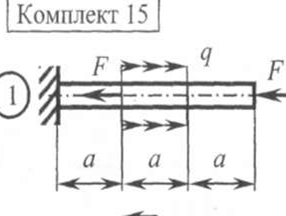 Для стержня, представленного на рисунке, заделанного концевым сечением, построить эпюры Nx, σx и δ. Определить размер сечения d (сечение круглое). Исходные данные: F=5кН, q=10кН/м, а=100см, материал чугун СЧ15-32; σв.р.=150МПа, σв.с.=640МПа, Е=1,5·105МПа, [n]в=4.