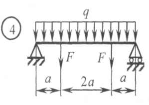 Для симметрично нагруженной балки, представленной на рисунке, вычислить опорные реакции и проверить их. Составить аналитические выражения изменения изгибающего моментов Мz и поперечной силы Qy. Построить эпюры изгибающих моментов Мz и поперечных сил Qy. На всех эпюрах обязательно указать числовые значения ординат в характерных сечениях участков. Принять: F=25кН, q=10кН/м, а=3,5м