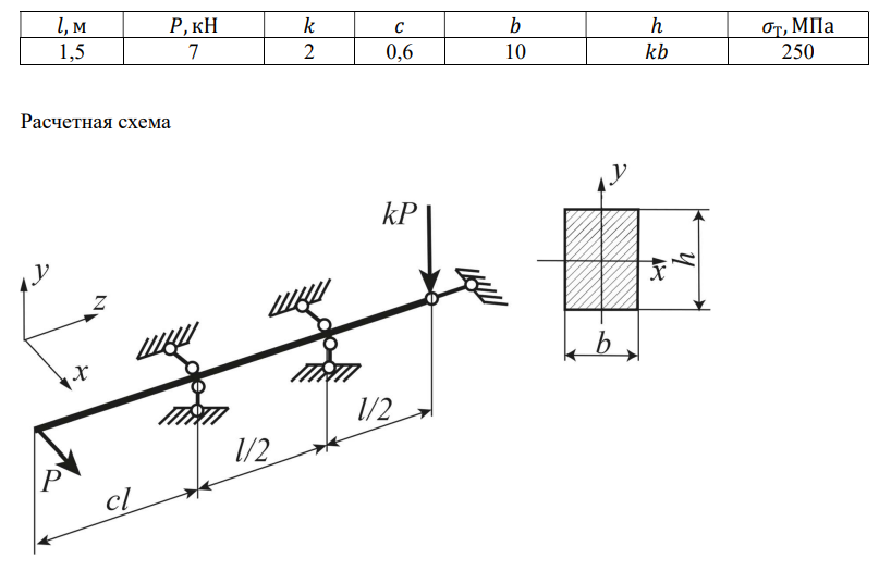 Для стальной балки прямоугольного поперечного сечения, находящейся под действием нагрузок в вертикальной и горизонтальной плоскостях, при заданных значениях геометрических размеров и расчетных значениях нагрузок требуется: