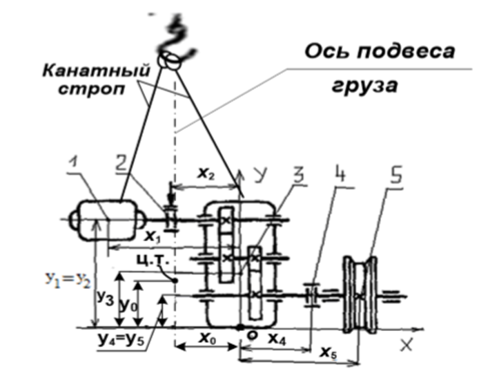 Определить координаты центра тяжести х0, у0 относительно осей Х, У механизма передвижения крана если известны координаты (хi, уi) центров тяжести: 1 – эл.двигателя; 2 - соединительной муфты с тормозом; 3 – редуктора; 4 – соединительной муфты; 5 – ходового колеса (рис.2).