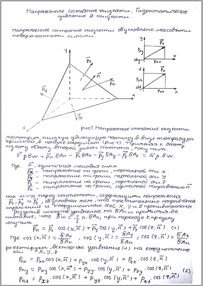 1. Для углубления знаний теоретических аспектов механики жидкости и газа по разделу «Гидростатика» написать краткий реферат на тему: « Напряженное состояние жидкости. Гидростатическое давление в жидкости».
