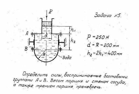 Определить силы, воспринимаемые болтовыми группами А и В. Весом поршня и стенок сосуда, а также трением поршня пренебречь Дано Р = 250Н, d = R = 200мм, h2 = 2h1 = 400мм.