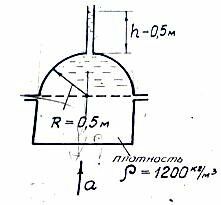 Определить силу давления на полусферическую крышку сосуда при его движении с вертикальным ускорением a = g. Дано h = 0,5м, R = 0,5м, р = 1200кг/м3