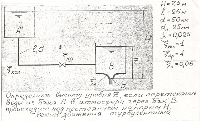 Для студентов МГТУ им. Н.Э.Баумана по предмету Механика жидкости и газа (МЖГ или Гидравлика)Задача с экзамена № 73 [Определить высоту уровня Z, если перетекание воды из бака А в атмосферу ...]Задача с экзамена № 73 [Определить высоту уровня Z, если перетекание воды из бака А в атмосферу ...]