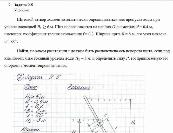 Щитовой затвор должен автоматически опрокидываться для пропуска воды при уровне последней 6 м. Щит поворачивается на цапфах О диаметром d = 0,4 м, имеющих коэффициент трения скольжения f = 0,2. Ширина щита B = 8 м, его угол наклона 60°.