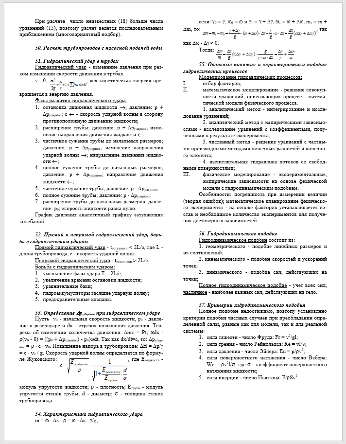 Расчет замкнутых или кольцевых трубопроводов 50. Расчет трубопроводов с насосной подачей воды 51. Гидравлический удар в трубах 52. Прямой и непрямой гидравлический удар, борьба с гидравлическим ударом 53. Определение D pударное при гидравлическом ударе 54. Характеристика гидравлического удара 55. Основные понятия и характеристики подобия гидравлических процессов 56. Гидродинамическое подобие 57. Критерии гидродинамического подобия.