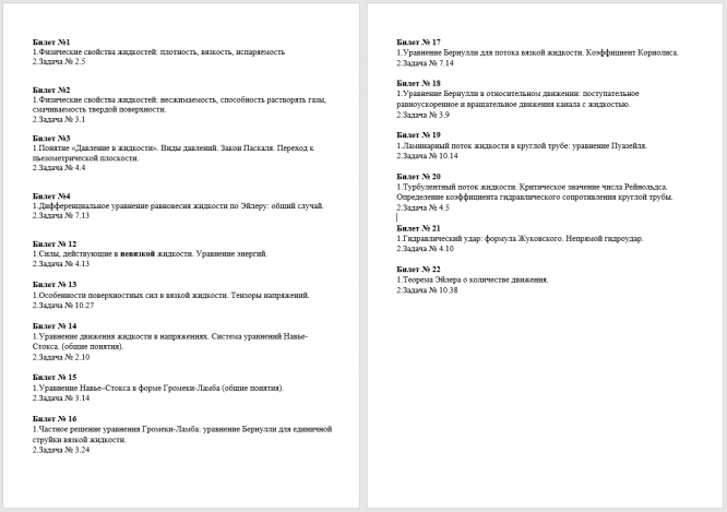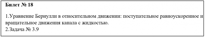 2.Задача № 2.10 1.Уравнение Навье–Стокса в форме Громеки-Ламба (общие понятия). 2.Задача № 3.14 1.Частное решение уравнения Громеки-Ламба: уравнение Бернулли для единичной струйки вязкой жидкости. 2.Задача № 3.24 1.Уравнение Бернулли для потока вязкой жидкости. Коэффициент Кориолиса. 2.Задача № 7.14 1.Уравнение Бернулли в относительном движении: поступательное равноускоренное и вращательное движения канала с жидкостью. 2.Задача № 3.9 1.Ламинарный поток жидкости в круглой трубе: уравнение Пуазейля. 2.Задача № 10.14 1.Турбулентный поток жидкости. Критическое значение числа Рейнольдса. Определение коэффициента гидравлического сопротивления круглой трубы. 2.Задача № 4.5 1.Гидравлический удар: формула Жуковского.