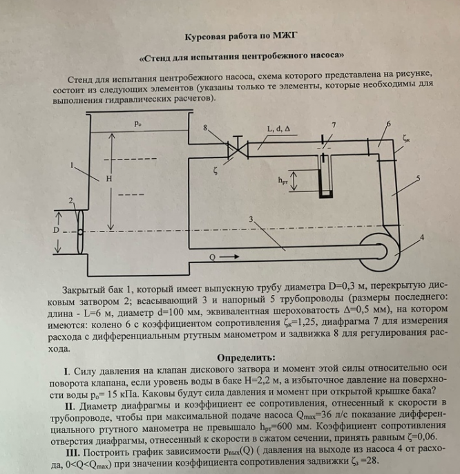 1.Определить силу давления на клапан дискового затвора и момент этой силы относительно оси поворота клапана, если уровень воды в баке , а избыточное давление на поверхности воды . Каковы будут сила и момент при открытой крышке бака?
