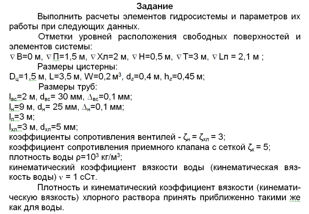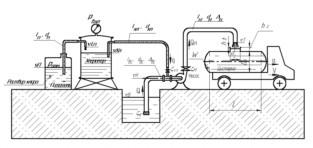 При работе насосной установки вода дезинфицируется раствором хлора, который самотеком по резиновому рукаву ( lхл, dхл) с имеющимся на его выходе вентилем с коэффициентом сопротивления в полностью открытом состоянии ζхл поступает во всасывающую трубу насоса из вакуумного хлоратора. Хлоратор представляет собой герметичный сосуд, в котором создается вакуум ( pв.хл), необходимый для пополнения хлоратора раствором хлора из питателя и для получения разности напоров в хлораторе и на входе в насос, обеспечивающей поступление нужного расхода q раствора во всасывающую трубу насоса. Убыль раствора в хлораторе пополняется из питателя по трубке из ПВХ ( lп, dп).