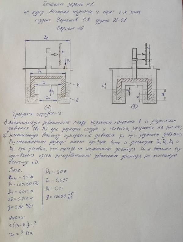 Для студентов МГТУ им. Н.Э.Баумана по предмету Механика жидкости и газа (МЖГ или Гидравлика)Домашнее задание №1 (вариант №16)Домашнее задание №1 (вариант №16)