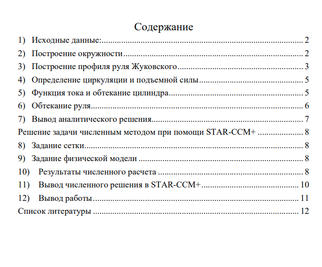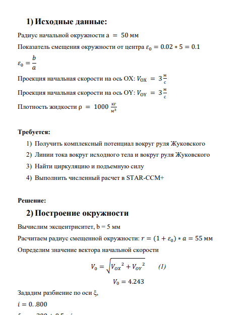 2 1)Исходные данные: Радиус начальной окружности a = 50 ммПоказатель смещения окружности от центра Проекция начальная скорости на ось OX: 푉୓ଡ଼ = 3мсПроекция начальная скорости на ось OY: 푉୓ଢ଼ = 3мсПлотность жидкости ρ = 1000 кгмయТребуется: 1)Получить комплексный потенциал вокруг руля Жуковского 2)Линии тока вокруг исходного тела и вокруг руля Жуковского 3)Найти циркуляцию и подъемную силу 4)Выполнить численный расчет в STAR-CCM+