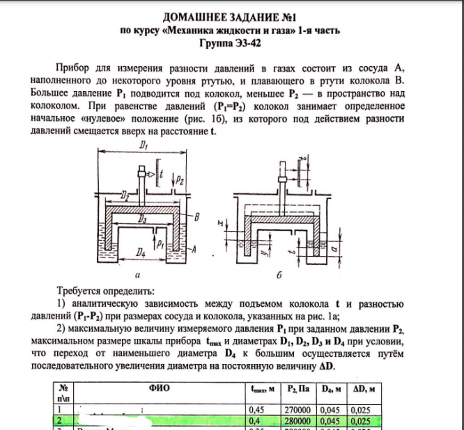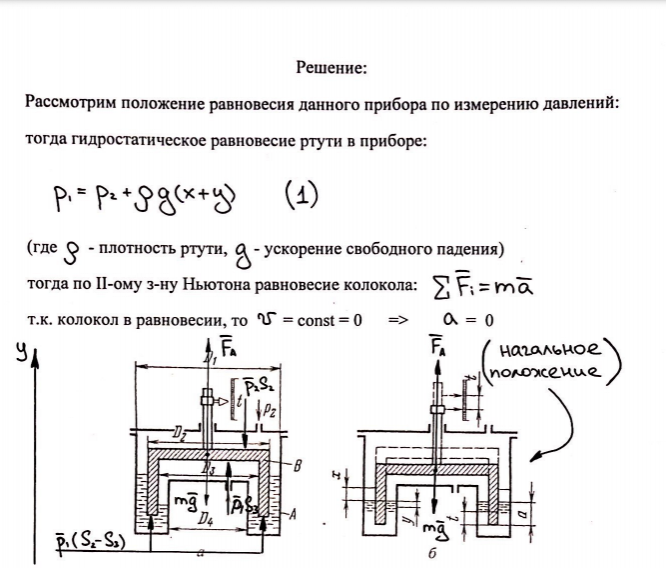 Задание: Прибор для измерения разности давлений в газах состоит из сосуда А, наполненного до некоторого уровня ртутью, и плавающего в ртути колокола В. Большее давление Р1 подводится под колокол, меньшее Р2 — в пространство над колоколом. При равенстве давлений (Р1=Р2) колокол занимает определенное начальное «нулевое » положение (рис. 1б), из которого под действием разности давлений смещается вверх на расстояние t.
