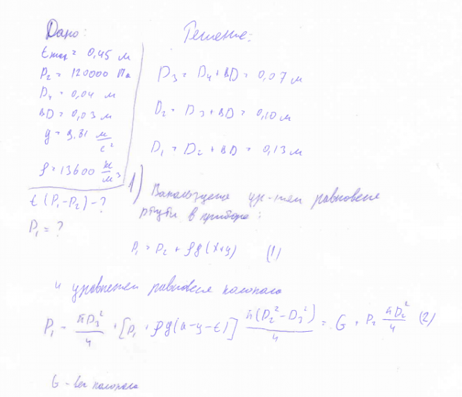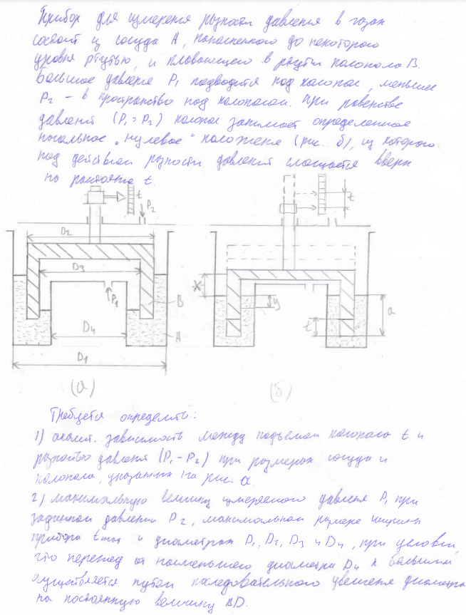 Задание: Прибор для измерения разности давлений в газах состоит из сосуда А, наполненного до некоторого уровня ртутью, и плавающего в ртути колокола В. Большее давление Р1 подводится под колокол, меньшее Р2 — в пространство над колоколом. При равенстве давлений (Р1=Р2) колокол занимает определенное начальное «нулевое » положение (рис. 1б), из которого под действием разности давлений смещается вверх на расстояние t.