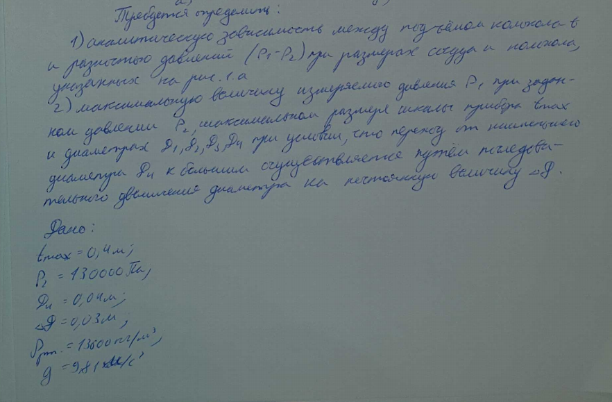 - максимальную величину измеряемого давления Р1 при заданном давлении Р2, максимальном размере шкалы прибора tmax и диаметрах D1, D2, D3 и D4 при условии, что переход от наименьшего диаметра D4 к большим осуществляется путём последовательного увеличения диаметра на постоянную величину ΔD