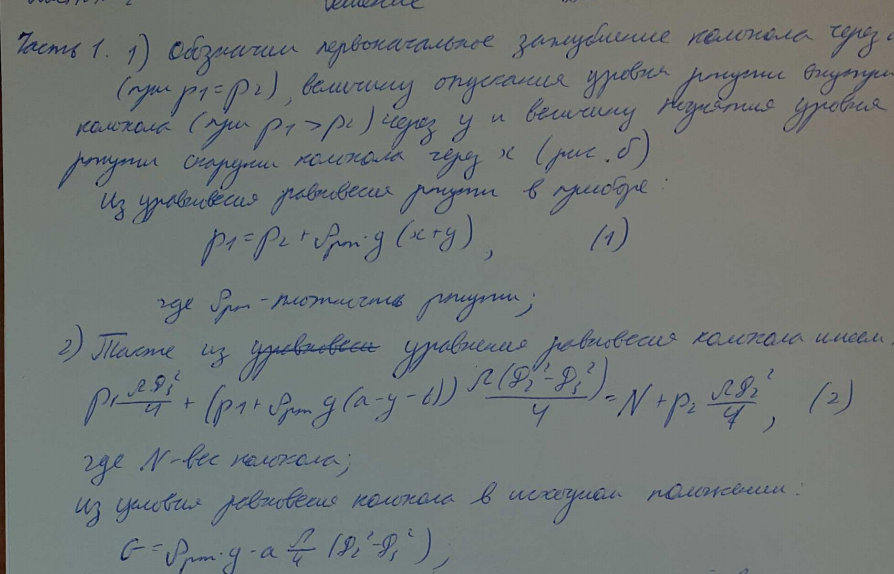 Задание: Прибор для измерения разности давлений в газах состоит из сосуда А, наполненного до некоторого уровня ртутью, и плавающего в ртути колокола В. Большее давление Р1 подводится под колокол, меньшее Р2 — в пространство над колоколом. При равенстве давлений (Р1=Р2) колокол занимает определенное начальное «нулевое » положение (рис. 1б), из которого под действием разности давлений смещается вверх на расстояние t.