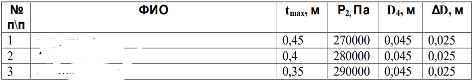 2. максимальную величину измеряемого давления Р1 при заданном давлении Р2, максимальном размере шкалы прибора tmax и диаметрах D1, D2, D3 и D4 при условии, что переход от наименьшего диаметра D4 к большим осуществляется путём последовательного увеличения диаметра на постоянную величину ΔD