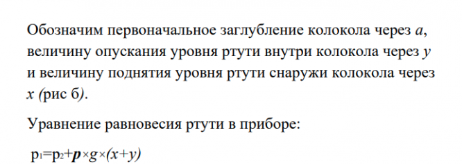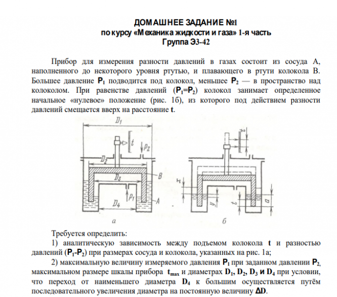 Задание: Прибор для измерения разности давлений в газах состоит из сосуда А, наполненного до некоторого уровня ртутью, и плавающего в ртути колокола В. Большее давление Р1 подводится под колокол, меньшее Р2 — в пространство над колоколом. При равенстве давлений (Р1=Р2) колокол занимает определенное начальное «нулевое » положение (рис. 1б), из которого под действием разности давлений смещается вверх на расстояние t.