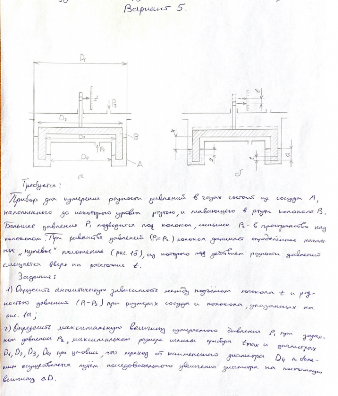 Задание: Прибор для измерения разности давлений в газах состоит из сосуда А, наполненного до некоторого уровня ртутью, и плавающего в ртути колокола В. Большее давление Р1 подводится под колокол, меньшее Р2 — в пространство над колоколом. При равенстве давлений (Р1=Р2) колокол занимает определенное начальное «нулевое » положение (рис. 1б), из которого под действием разности давлений смещается вверх на расстояние t.