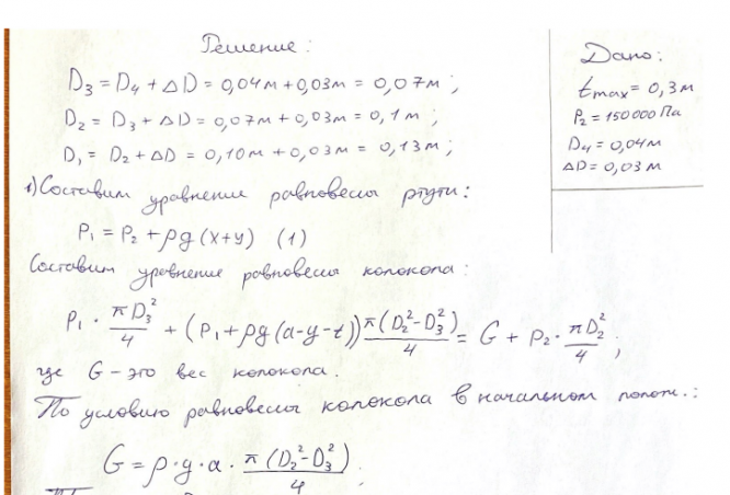 2. максимальную величину измеряемого давления Р1 при заданном давлении Р2, максимальном размере шкалы прибора tmax и диаметрах D1, D2, D3 и D4 при условии, что переход от наименьшего диаметра D4 к большим осуществляется путём последовательного увеличения диаметра на постоянную величину ΔD