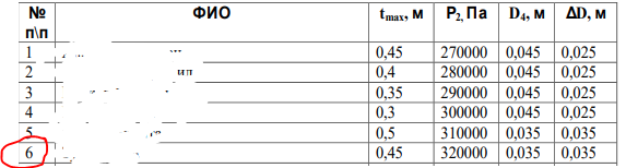 - максимальную величину измеряемого давления Р1 при заданном давлении Р2, максимальном размере шкалы прибора tmax и диаметрах D1, D2, D3 и D4 при условии, что переход от наименьшего диаметра D4 к большим осуществляется путём последовательного увеличения диаметра на постоянную величину ΔD