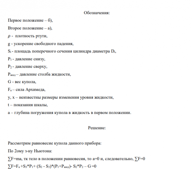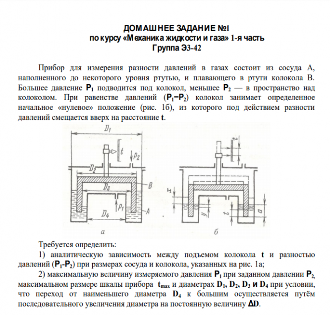 Задание: Прибор для измерения разности давлений в газах состоит из сосуда А, наполненного до некоторого уровня ртутью, и плавающего в ртути колокола В. Большее давление Р1 подводится под колокол, меньшее Р2 — в пространство над колоколом. При равенстве давлений (Р1=Р2) колокол занимает определенное начальное «нулевое » положение (рис. 1б), из которого под действием разности давлений смещается вверх на расстояние t.