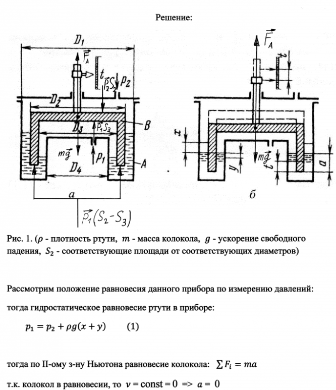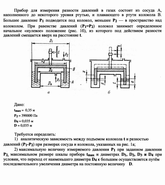 Задание: Прибор для измерения разности давлений в газах состоит из сосуда А, наполненного до некоторого уровня ртутью, и плавающего в ртути колокола В. Большее давление Р1 подводится под колокол, меньшее Р2 — в пространство над колоколом. При равенстве давлений (Р1=Р2) колокол занимает определенное начальное «нулевое » положение (рис. 1б), из которого под действием разности давлений смещается вверх на расстояние t.